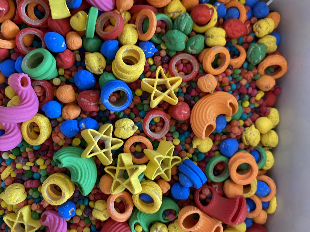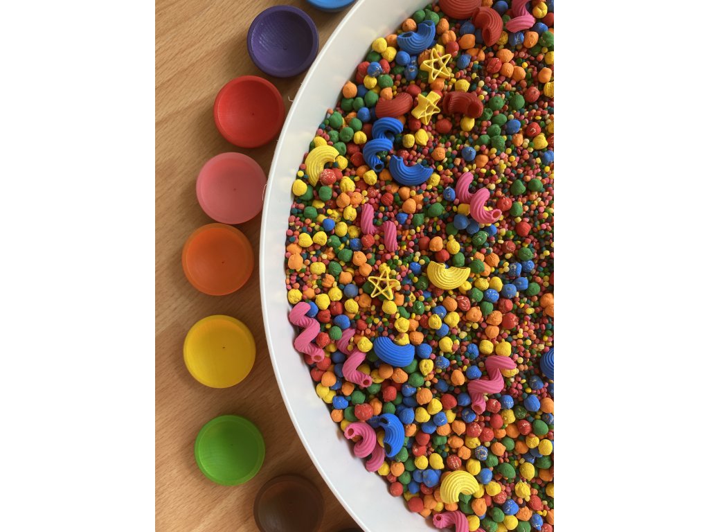 Barevné těstoviny a cizrna různých tvarů - pro třídění, poznávání, hmatové hry. Rozvíjí jemnou motoriku, zvědavost a vizuální vnímání.